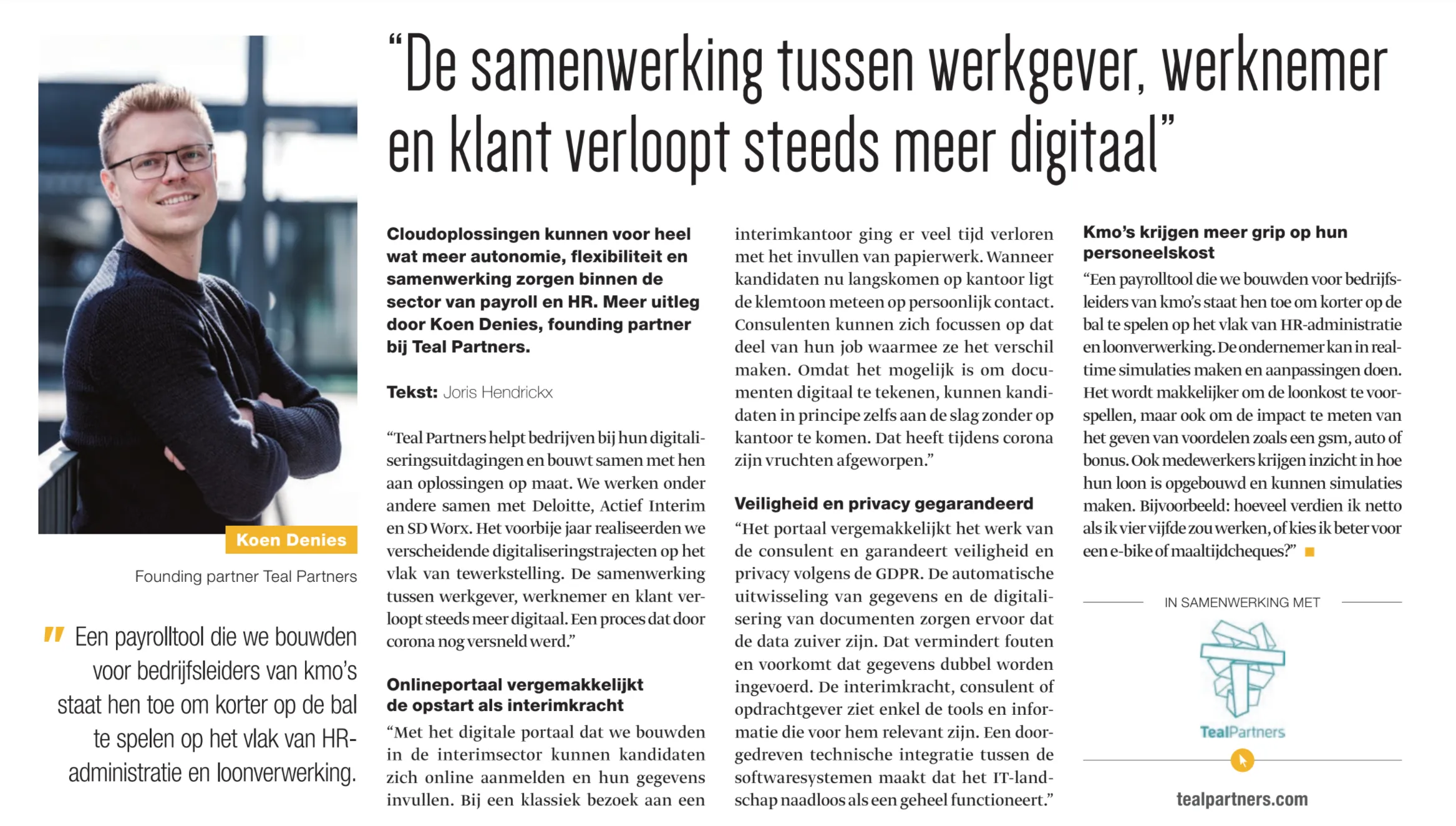 Teal Partners assists companies in their digitalization challenges and collaborates with them to create customized solutions. We work with partners such as Deloitte, Actief Interim, and SD Worx. Over the past year, we have implemented several digitalization projects in the field of employment. The collaboration between employer, employee, and customer is becoming increasingly digital. A process that has been further accelerated by the coronavirus.